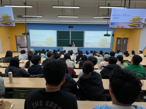 周老师首先介绍了香樟校区图书馆的基本情况,设有自习室、图书阅览室、电子阅览室、交流研讨室等区域,提供465个阅览座位,纸质图书35万册、电子图书130万册,实行“藏、借、阅一体化”开放。同时重点强调:“一定要关注‘南昌职业大学图书馆’微信公众号”,并讲解公众号功能——点击“我的图书馆”可查馆藏、续借图书、看借阅历史、荐购新书;“服务导航”能了解电子资源访问流程、开放时间,还能咨询AI馆员;此外公众号会推送“南职大讲堂”、考研直播等活动预告,方便及时获取资讯。