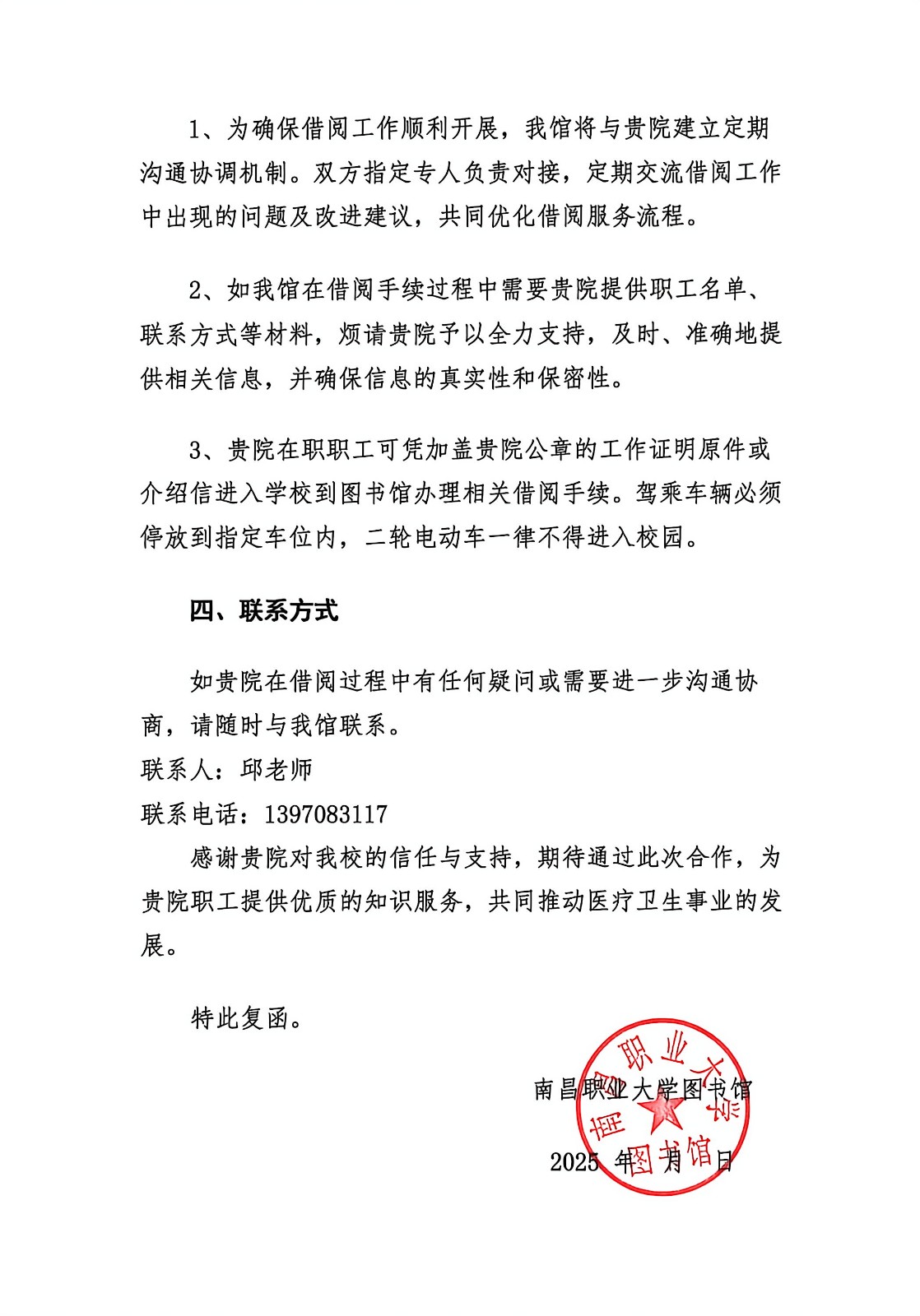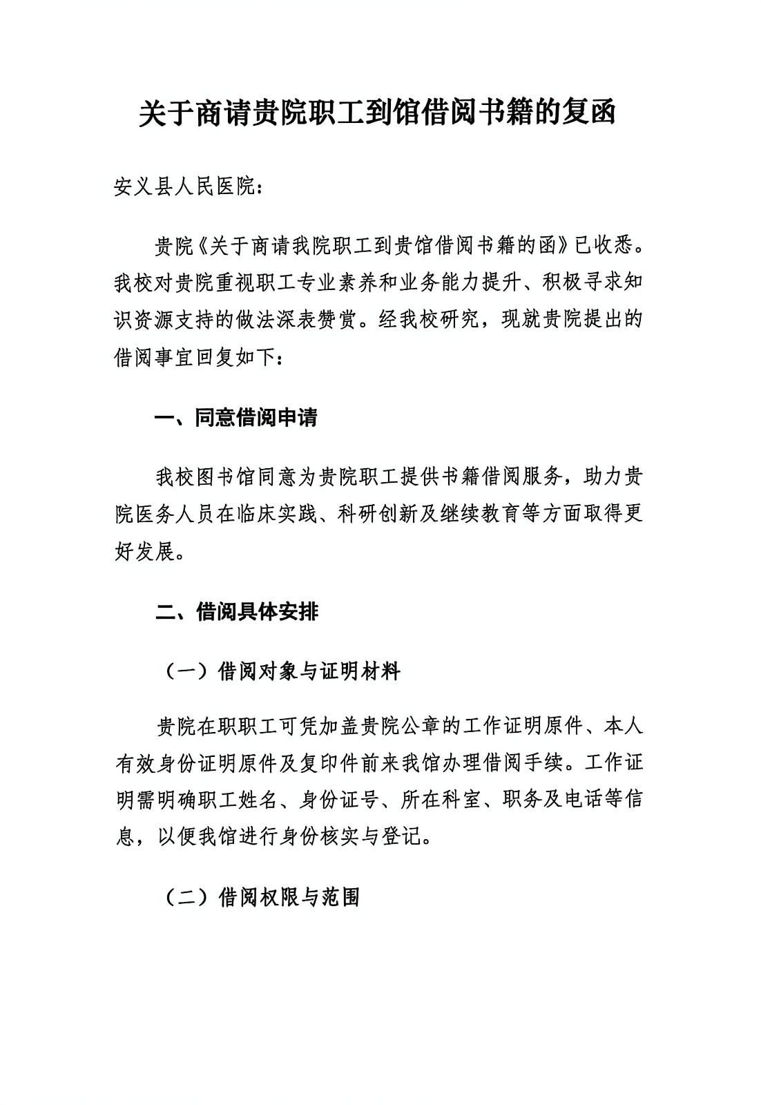 为感谢广大医务工作者的辛勤付出,并支持其终身学习与专业提升,我校图书馆特别向安义县人民医院的职工开放借阅权限。安义县人民医院职工可通过单位集体备案的